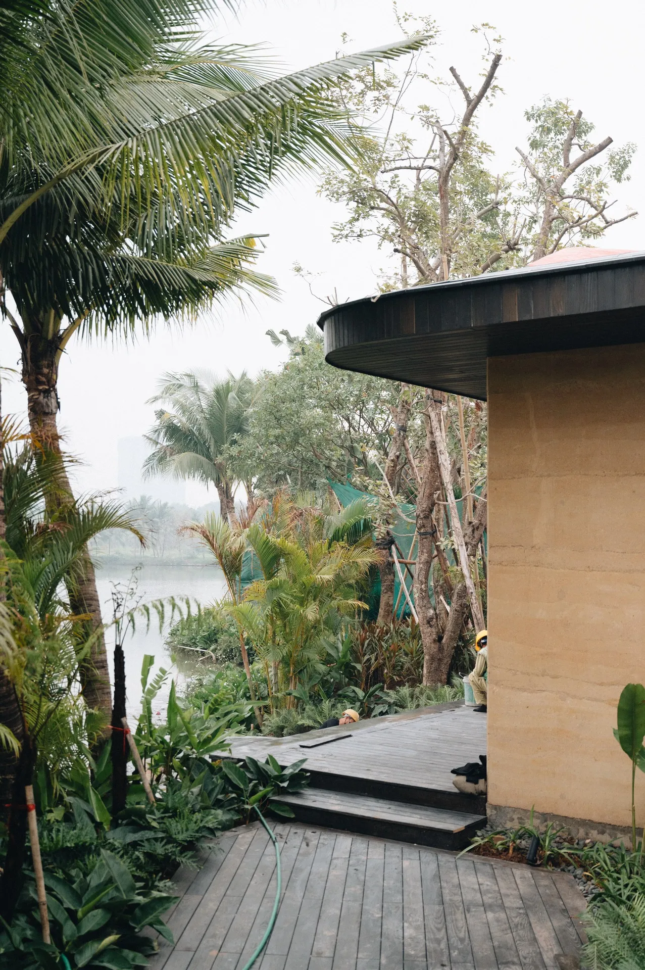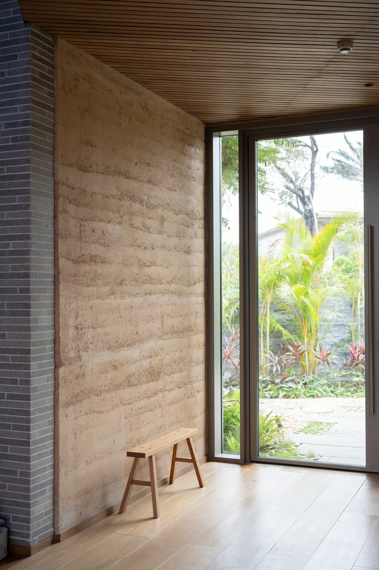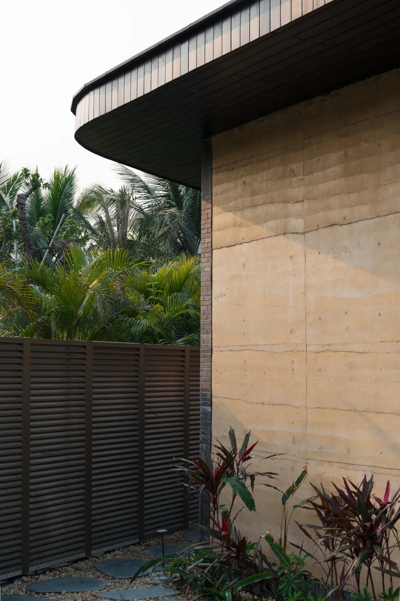 The house is shaped by wood, brick, and rammed earth, with textures and tones that vary throughout. Locally sourced timber suited for the hot, humid conditions brings warmth and depth.