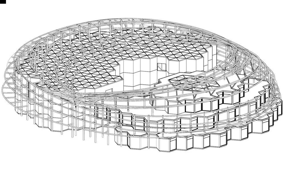 The Green Eye is built in a modular hexagonal grid, providing an affordable, durable, and iconic foundation for the architecture. This results in a circular layout, giving a seamless flow around and within the building, allowing visitors to explore the entire site.